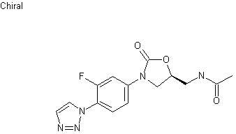 The reaction between 1,2,3-triazole (I) and 3,4-difluoronitrobenzene (II) afforded a mixture of two regioisomeric substituted triazoles (III) and (IV), from which the required 1-substituted isomer (III) was isolated by column chromatography. Reduction of the nitro group of (III) by hydrogenation over Raney-Ni gave aniline (V), which was converted to carbamate (VI) upon treatment with benzyl chloroformate. Subsequent condensation of (VI) with (R)-(-)-glycidyl butyrate (VII) in the presence of lithium bis(trimethylsilyl)amide produced the chiral oxazolidinone (VIII). Mesylation of the alcohol group of (VIII), followed by displacement with NaN3 yielded azide (IX). This was reduced by hydrogenation over Raney-Ni to give amine (X), which was finally acetylated using Ac2O and pyridine.