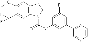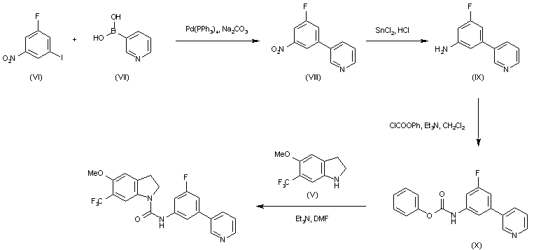 3-Fluoro-5-(3-pyridyl)aniline (IX) was prepared by palladium coupling of 3-fluoro-5-iodonitrobenzene (VI) and 3-pyridylboronic acid (VII), followed by reduction of the resultant nitro derivative (VIII) using stannous chloride in aqueous HCl (3). Treatment of aniline (IX) with phenyl chloroformate in the presence of triethylamine gave rise to carbamate (X). This was then coupled with indoline (V) to furnish the title amide.