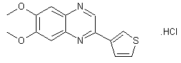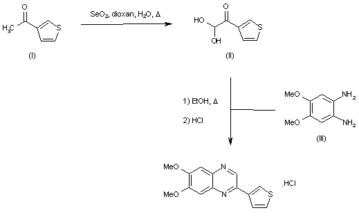 Oxidation of 3-acetylthiophene (I) with selenium dioxide in refluxing dioxan provided 3-thienylglyoxaldehyde hydrate (II). This was then condensed with 4,5-dimethoxy-1,2-phenylenediamine (III) in boiling EtOH to produce the target quinoxaline, which was finally isolated as the hydrochloride salt.