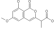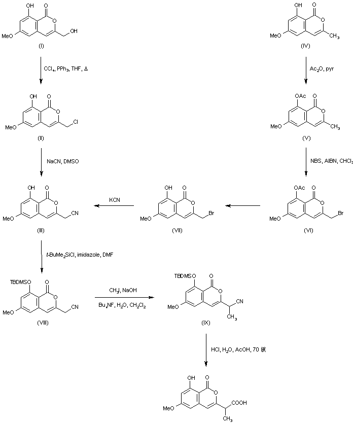 Chlorination of cytogenin (I) using carbon tetrachloride and triphenylphosphine provided chloride (II). Subsequent displacement of the halogen atom of (II) by NaCN afforded nitrile (III). In an alternative procedure, the isocoumarin (IV) was protected as the acetate ester (V) and then brominated to (VI) employing N-bromosuccinimide. After deprotection of the acetate ester of (VI), displacement by KCN yielded nitrile (III). The hydroxyl group of (III) was then silylated by means of tert-butyldimethylsilyl chloride and imidazole to give (VIII). Subsequent alkylation of (VIII) with methyl iodide under phase-transfer conditions furnished the alpha-methyl nitrile (IX). Finally, acid hydrolysis of the nitrile group of (IX) with concomitant desilylation provided the title compound.