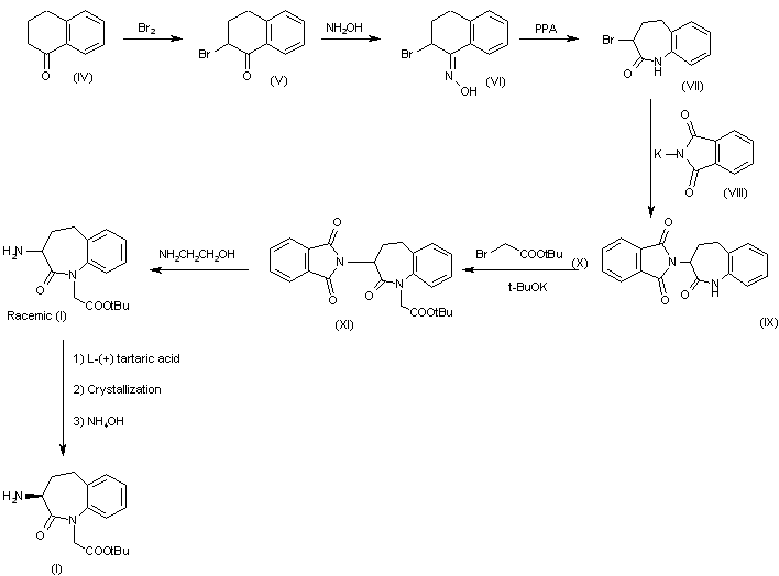 2a) The chiral intermediate amine (I) has been obtained as follows: The bromination of 1-tetralone (IV) with Br2 in methanol gives the 2-bromotetralone (V), which is treated with hydroxylamine yielding the corresponding oximae (VI). The isomerization of (V) with polyphosphoric acid (PPA) at 80 C affords the benzazepinone (VII), which is treated with potassium phthalimide (VIII) in DMF to give the corresponding phthalimido derivative (IX). The reaction of (IX) with tert-butyl bromoacetate (X) by means of potassium tert-butoxide in DMF yields the benzazepinoacetic ester (XI), which is treated with hot ethanolamine to eliminate the phthalimido group yielding racemic (I). Finally, this racemate is submitted to optical resolution with L-(+)-tartaric acid to afford the chiral (S)-intermediate (I).