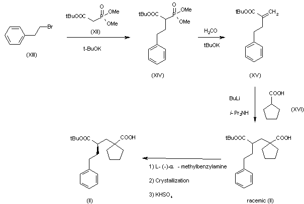 2b) The alkylation of 2-(dimethoxyphosphoryl)acetic acid tert-butyl ester (XII) with 2-phenylethyl bromide (XIII) by means of potassium tert-butoxide in DMF gives 2-(dimethoxyphosphoryl)-4-phenylbutyric acid tert-butyl ester (XIV), which is allowed to react with formaldehyde/potasium tert-butoxide in THF to afford the tert-butyl acrylate (XV). The condensation of (XV) with cyclopentanecarboxylic acid (XVI) by means of butyllithium/diisopropylamine in THF affords racemic (II), which is finally submitted to optical resolution with L-(-)-alpha-methylbenzylamine to afford the chiral (R)-intermediate (II).