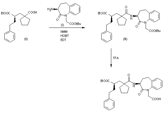 1) The acylation of the chiral amine (I) with the chiral cyclopentanecarboxylic aid (II) by means of N-methylmorphline (NMM), hydroxybenzotriazole (HOBT) and N-(dimethylaminopropyl)-N'-ethylcarbodiimide (EDT) in dichloromethane gives the amide (III), which is then treated with trifluoroacetic acid to elimnate the tert-butyl ester groups.