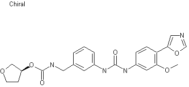 The oxidation of 3-methoxy-4-methylnitrobenzene (I) with CrO3, H2SO4 and AC2O in acetic acid gives the gem-diacetate (II), which is hydrolyzed with HCl in refluxing dioxane to yield 2-methoxy-4-nitrobenzaldehyde (III). Cyclization of (III) with tosylmethyl isocyanide and K2CO3 in refluxing methanol affords 3-methoxy-4-(5-oxazolyl)nitrobenzene (IV), which is reduced with H2 over Pd/C in ethyl acetate to provide the corresponding aniline (V). The activation of (V) with carbonyldiimidazole (CDI) in THF gives the carboxamide (VI), which is condensed with 3-(tert-butoxycarbonylaminomethyl)aniline (VII), obtained by reaction of 3-aminobenzylamine with Boc2O, and DMAP in refluxing THF to yield the urea (IX). Deprotection of (IX) with TFA in dichloromethane affords the free benzylamine (X), which is finally condensed with the 3-furyl ester of the succinimidyl-activated carbonate (XI) by means of TEA in dichloromethane/DMF.