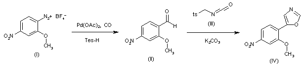 The desired intermediate 5-(2-methoxy-4-nitrophenyl)oxazole (IV) has been obtained as follows. The carbonylation of 2-methoxy-4-nitrophenyldiazonium tetrafluoroborate (I) by means of carbon monoxide catalyzed by Pd(OAc)2 and Tes-H in ethyl ether/acetonitrile gives 2-methoxy-4-nitrobenzaldehyde (II), which is cyclized with tosylmethyl isocyanate (III) by means of K2CO3 in refluxing methanol to afford the target intermediate 5-(2-methoxy-4-nitrophenyl)oxazole (IV) (see scheme no. 24362801a, intermediate (IV)).