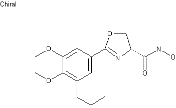 This compound can be prepared by two related ways: 1) Nitrile (I) was converted to iminoester (II) with methanolic HCl, which was then condensed with (R)-serine methyl ester (III) to give oxazoline (IV). Further reaction of (IV) with O-benzyl hydroxylamine in the presence of AlMe3 provided hydroxamate (VII). Finally, the O-benzyl protecting group was removed by hydrogenolysis over Pd/C. 2) Alternatively, coupling of the benzoic acid (V) with (R)-serine methyl ester (III) produced amide (VI), which was cyclized to the alredy described oxazolidine (IV) with SOCl2.