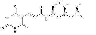 Diastereoselective oxidation of sulfide (I) with tert-butyl hydroperoxide in the presence of titanium isopropoxide and (R)-binaphthol at 4 C yielded the (S)-sulfoxide (II) with an 85% diastereomeric excess. Recrystallization from dichloromethane-hexane provided optically pure (II), from which the N-benzyloxycarbonyl group was removed by means of Na/NH3 to give amine (III). Sulfenylation was then achieved by treatment with dimethyl disulfide in the presence of LDA to afford the thioacetal mono-S-oxide (IV) together with some doubly sulfenylated product. Subsequent coupling with b-(6-methyluracil)-acrylic acid (V) using dicyclohexylcarbodiimide (DCC) and 1-hydroxybenzo-7-azatriazole (HOAt) provided amide (VI). Further oxidation of (VI) with NaIO4 yielded an equimolecular mixture of dioxothioacetals (VII) and (VIII), from which the desired diastereoisomer (VII) was isolated by ODS column chromatography, followed by reverse-phase HPLC. Finally, removal of the protecting methoxymethyl group was effected with the acidic ion-exchange resin Dowex 50W in MeOH at 50 C to provide the title compound.