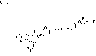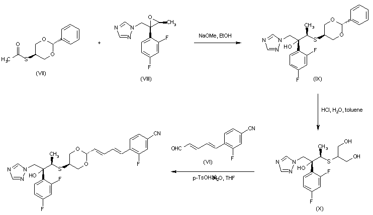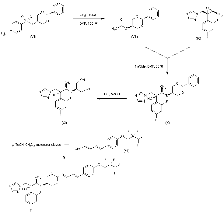 Displacement of tosylate (VII) with sodium thioacetate afforded thioester (VIII) (1). Hydrolysis of the thioester (VIII) in the presence of NaOMe, followed by condensation of the intermediate thiol with the chiral epoxide (IX) furnished the mercapto alcohol (X). Hydrolysis of the cyclic acetal of (X) in methanolic HCl gave triol (XI). This was finally condensed with aldehyde (VI) in the presence of p-TsOH and molecular sieves to yield the title compound.