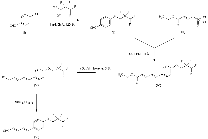 4-Hydroxybenzaldehyde (I) was alkylated with 2,2,3,3-tetrafluoropropyl tosylate (A) to give ether (II). Subsequent Horner-Emmons condensation of (II) with triethyl phosphonocrotonate (III) provided dienoate (IV), that was further reduced to alcohol (V) by means of DIBAL. Oxidation of (V) with activated MnO2 then gave aldehyde (VI).