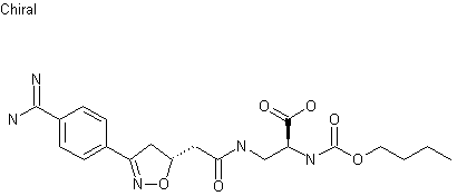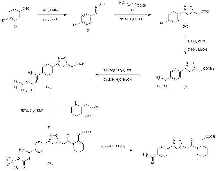 4-Formylbenzonitrile (I) was converted to oxime (II) by treatment with hydroxylamine hydrochloride in pyridine-ethanol. Chlorination of the oxime with NaOCl, followed by dehydrohalogenation of the intermediate imidoyl chloride and dipolar cycloaddition to vinylacetic acid (III) produced the racemic isoxazoline (IV). The cyano group of (IV) was then converted to amidine (V) by formation of the corresponding imidate and subsequent treatment with methanolic ammonia. After protection of the amidine function of (V) as the Boc-derivative, ester hydrolysis employing LiOH yielded carboxylic acid (VI) (1). Coupling of acid (VI) with the racemic ethyl 2-piperidineacetate (VII) in the presence of O-(1H-benzotriazol-1-yl)-N,N,N',N'-tetramethyluronium tetrafluoborate (TBTU) furnished a diastereomeric mixture of amides (VIII). The Boc group of (VIII) was finally cleaved by means of trifluoroacetic acid.
