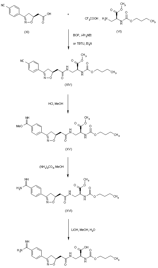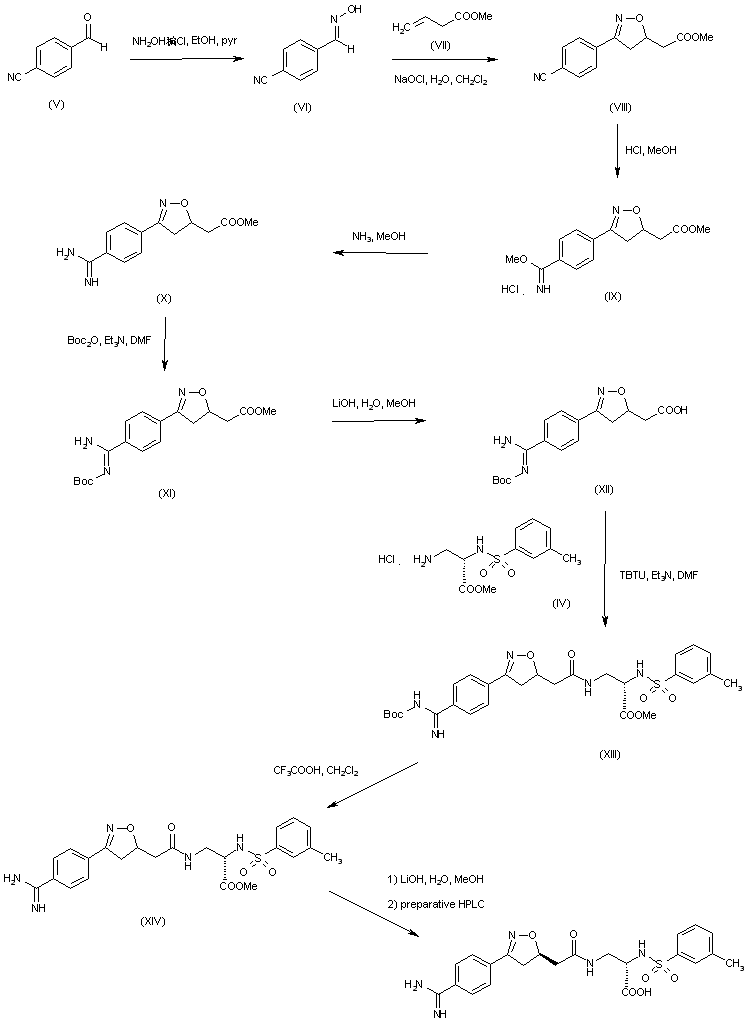 Oxime (VI) was prepared from 4-cyanobenzaldehyde (V) upon treatment with hydroxylamine-HCl and pyridine. The nitrile oxide generated from oxime (VI) and NaOCl underwent a dipolar cycloaddition to methyl butenoate (VII) to produce the racemic isoxazoline (VIII). After conversion of the nitrile group of (VIII) to imidate (IX), reaction with methanolic ammonia yielded amidine (X), which was protected with Boc2O to give (XI). Hydrolysis of the methyl ester of (XI) with LiOH provided carboxylic acid (XII), which was coupled to amine (IV) using TBTU to afford amide (XIII) as a diasteromeric mixture. After Boc group removal by acidic treatment yielding (XIV), its methyl ester group was hydrolyzed with LiOH to afford the corresponding acid. The diastereomeric mixture of carboxylic acids was finally separated by preparative chiral HPLC.