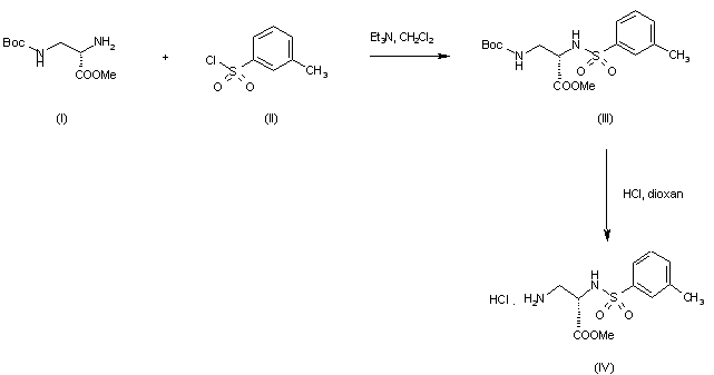 Preparation of intermediate (IV) is illustrated in Scheme 25654801a: Methyl N3-Boc-(S)-2,3-diaminopropionate (I) was condensed with m-toluenesulfonyl chloride (II) to provide sulfonamide (III). The Boc group was then deprotected with HCl in dioxan to give amine (IV).
