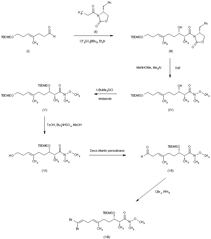 Preparation of fragment (VIII) is illustrated in Scheme 24509401a. Aldol condensation of aldehyde (I) with (R)-4-benzyl-3-propionyl-2-oxazolidinone (II) mediated by dibutylboron triflate gives the syn aldol adduct (III). This is converted to the Weinreb amide (IV) by treatment with N,O-dimethyl hydroxylamine in the presence of trimethylaluminium. After silylation of the secondary hydroxyl group of (IV), the resultant bis-silyl ether (V) is selectively desilylated at the primary hydroxyl group with p-toluenesulfonic acid and tetrabutylammonium bisulfate, to afford alcohol (VI). Dess-Martin oxidation of (VI) gives the aldehyde (VII), which is then subjected to Corey-Fuchs olefination with CBr4 and PPh3 to produce the gem-dibromo olefin (VIII)