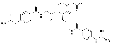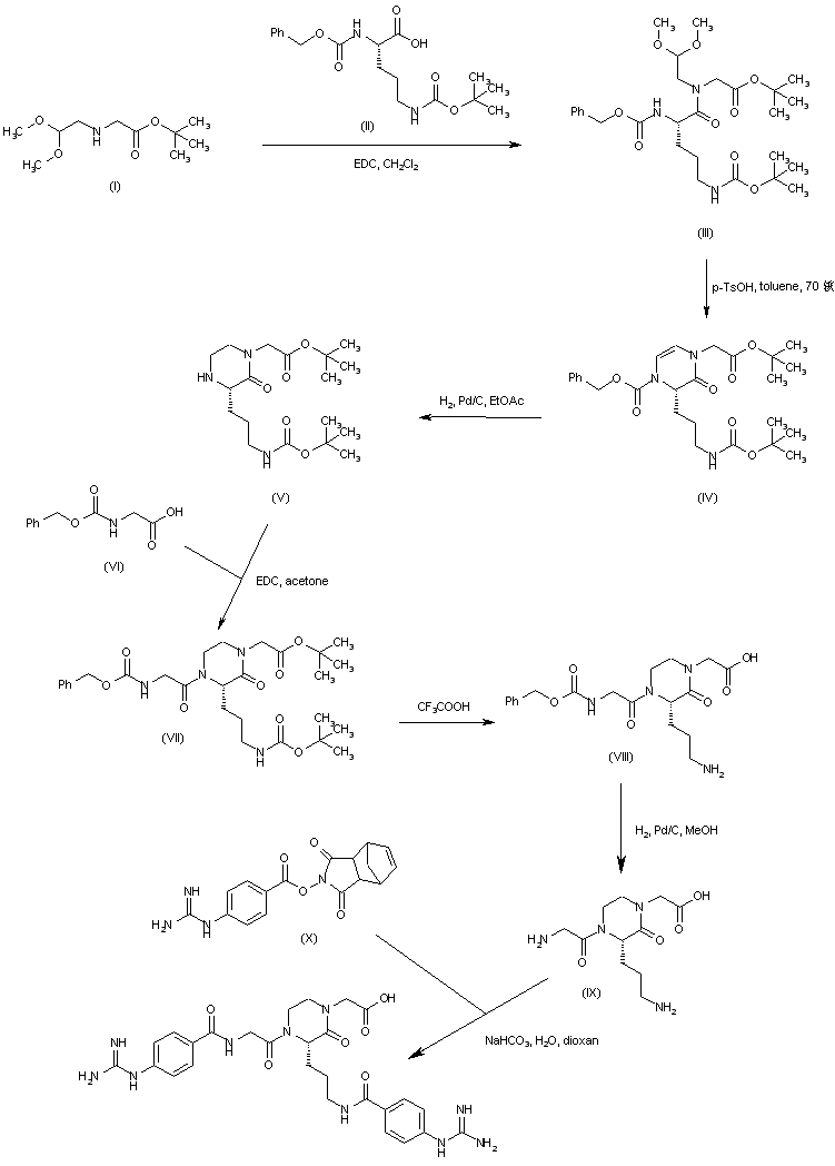 Condensation of the secondary amine (I) with N5-Boc-N2-Z-ornithine (II) using EDC provided the acetal amide (III), and subsequent acid-catalyzed intramolecular cyclization of (III) in hot toluene gave rise to the pyrazinone (IV). Catalytic hydrogenation of the double bond with concomitant hydrogenolysis of the benzyloxycarbonyl group of (IV) provided the 1,3-substituted-2-oxopiperazine (V). This was condensed with Z-glycine (VI) to give amide (VII). Then, acid cleavage of the tert-butyl ester and N-Boc protecting groups of (VII) provided (VIII). The N-benzyloxycarbonyl group of (VIII) was subsequently removed by hydrogenolysis, yielding diamine (IX). Finally, acylation of (IX) with the imido ester of 4-guanidinobenzoic acid (X) furnished the title bis(4-guanidinobenzamide).