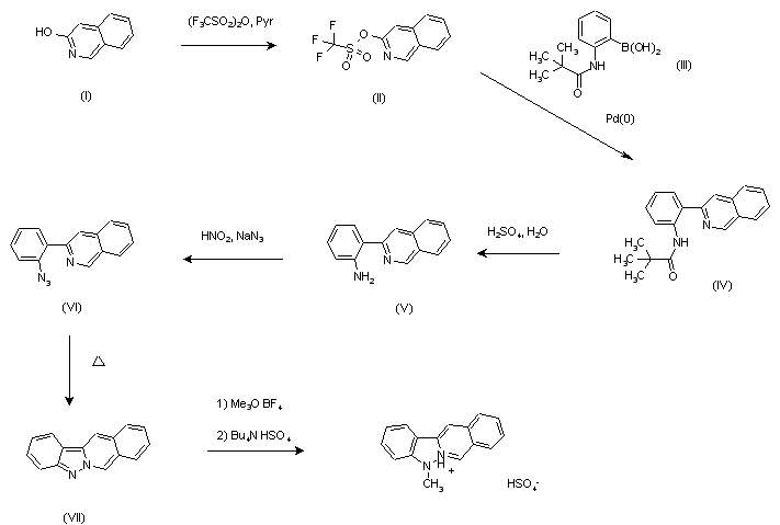 3-Hydroxyisoquinoline (I) was converted to triflate (II) on treatment with trifluoromethanesulfonic anhydride, and this was coupled with o-pivaloylaminophenylboronic acid (III) in the presence of Pd(0) to give (IV). Hydrolysis of pivaloyl amide was effected with 20% sulfuric acid, and the resulting amine (V) was transformed into azide (VI) through diazotation with nitrous acid followed by treatment with sodium azide. Ring closure of azide (VI) at 180 C afforded the tetracyclic compound (VII), and this was methylated with Meerwein's salt, and converted to hydrogensulfate salt on treatment with tetrabutylammonium hydrogensulfate.