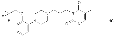 The condensation of 2-nitrophenol (I) with 2,2,2-trrifluoroethyl p-toluenesulfonate (II) by means of K2CO3 in DMF gives 2-(2,2,2-trifluoroethoxy) nitrobenzene (III), which isreduced with H2 over PtO2 in ethanol yiedling the aniline (IV). The cyclization of (IV) with bis (2-chloroethyl)amine (V) and K2CO3 affords the piperazine (VI), which is condensed with 1-benzyl-3-(3-chloro-propyl)-5-methylpyrimidine-2,4(1H,3H)-dione (VII) by means of K2CO3 in refluxing acetonitrile to give the benzylated target compound (VIII). Finally, this compound is deprotected by hydrogenation with ammonium formate and Pd/C. The intermediate pyrimidine (VII) has been obtained by benzylation of thymine (IX) with benzyl bromide and K2CO3 to give the 1-benzylthymine (X), which is alkylated with 1-bromo-3-chloropropane and K2CO3 to the target intemediate (VII).