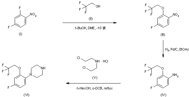 The intermediate arylpiperazine (VI) was prepared as follows: Reaction of 2,4-difluoronitrobenzene (I) with trifluoroethanol (II) in the presence of potassium tert-butoxide yielded the trifluoroethyl ether (III). After catalytic hydrogenation of the nitro group of (III), the resultant aniline (IV) was cyclized with bis(2-chloroethyl) amine hydrochloride (V) in a refluxing mixture of o-dichlorobenzene and n-hexanol to afford the target piperazine (VI).
