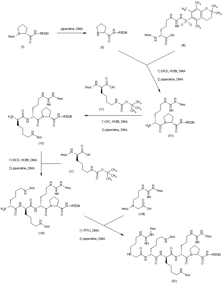 The title compound was prepared by solid-phase peptide synthesis starting from N-Fmoc-D-proline linked to Rink resin (I). Deprotection of the Fmoc group by means of piperidine in DMA afforded proline-resin (II). Coupling of N-alpha-Fmoc-NG-Pmc-D-arginine (III) to proline-resin (II) using diisopropyl carbodiimide (DIC) and HOBt, followed by Fmoc deprotection with piperidine in DMA, furnished dipeptide-resin (IV). Further coupling and deprotection cycles incorporating the amino acid N2-Fmoc-N6-Boc-D-lysine (V) (twice) and the peptoid residue N-Fmoc-N-[3-(3-Pmc-guanidino)propyl]glycine (VIII) yielded the peptide resins (VI), (VII) and (IX), respectively.