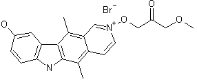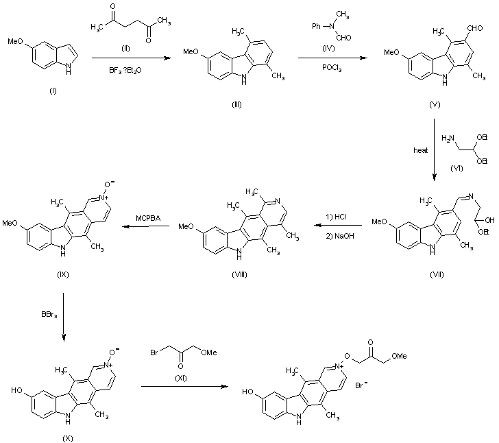 The cyclization of 5-methoxy-1H-indole (I) with hexane-2,6-dione (II) by means of BF3 ethearate in refluxing dioxane gives 6-methoxy-1,4-dimethylcarbazole (III), which is formylated with N-methylformanilide (IV) and POCl3 in hot o-dichlorobenzene yielding the 3-formyl derivative (V). The condensation of (V) with 2-aminoacetaldehyde diethylacetal (VI) by heating at 100 C affords the expected imino derivative (VII), which is cyclized by acid (HCl) hydrolysis of the acetal group and cyclization of the resulting aldehyde by means of NaOH in water to the 9-methoxy-5,11-dimethyl-6H-pyrido[4,3-b]carbazole (VIII). The oxidation of (VIII) with m-chloroperbenzoic acid (MCPBA) in acetone gives the correponding N-oxide (IX), which is treated with BBr3 in dichloromethane yielding 9-hydroxy-5,11-dimethyl-6H-pyrido[4,3-b]carbazole (X). Finally, this compound is treated with 1-bromo-3-methoxy-2-propanone in DMF to afford the desired quaternary salt.