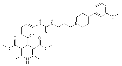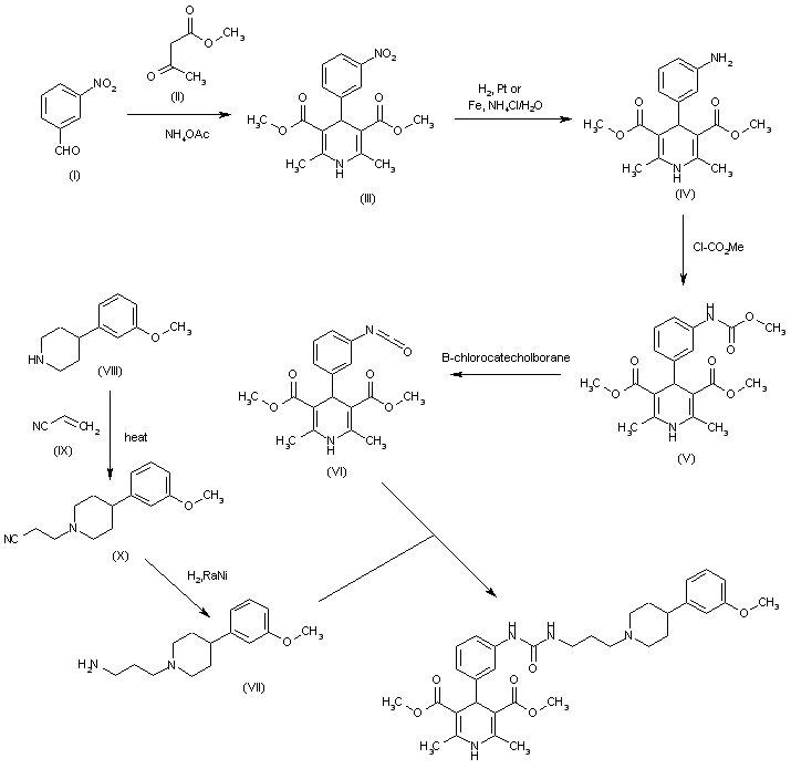 The Hantzsch cyclization of 3-nitrobenzaldehyde (I), methyl acetoacetate (II) and NH4OAc in refluxing ethanol or isopropanol gives 2,6-dimethyl-4-(3-nitrophenyl)-1,4-dihydropyridine-3,5-dicarboxylic acid dimethyl ester (III), which is reduced with H2 over sulfided carbon in ethanol or with Fe/NH4Cl in methanol/water to yield the corresponding amino derivative (IV). The reaction of (IV) with methyl chloroformate and pyridine in acetonitrile/dichloromethane affords the carbamate (V), which is treated with B-chlorocatecholborane in refluxing THF to provide the corresponding isocyanate (VI). Finally, this compound is condensed with 3-[4-(3-methoxyphenyl)piperidin-1-yl]propylamine (VII) in dichloromethane to furnish the target urea. The intermediate 3-[4-(3-methoxyphenyl)piperidin-1-yl]propylamine (VII) is obtained by condensation of 4-(3-methoxyphenyl)piperidine (VIII) with acrylonitrile (IX) in refluxing acetonitrile to give 3-[4-(3-methoxyphenyl)piperidin-1-yl]propionitrile (X), which is reduced with H2 over Raney-Ni in methanol/aq. NH3.
