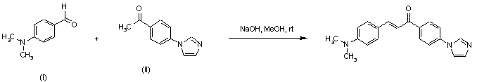 The compound is prepared by aldol condensation between 4-dimethylaminobenzaldehyde (I) and imidazolyl acetophenone (II) in the presence of NaOH in methanol.