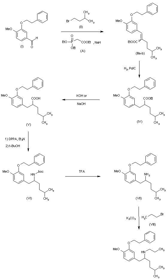 Wittig reaction between aldehyde (I) and bromo derivative (II) by means of triethyl phosphonoacetate and NaH in 1,2-dimethoxyethane (A) affords a mixture of isomeric acrylates (IIIa-b), which are hydrogenated over Pd/C in EtOH to yield derivative (IV). Hydrolysis of ethyl ester (IV) by means of KOH or NaOH provides carboxylic acid (V), which is then converted into N-protected derivative (VI) by first treatment with diphenylphosphoryl azide (DPPA) and Et3N in refluxing benzene, followed by reaction with refluxing t-butanol. Boc removal of (VI) with TFA in CH2Cl2 furnishes free amine (VII), which is finally alkylated with propyl bromide (VIII) by means of K2CO3 in DMF to yield the target product.
