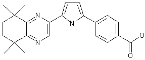 Fischer esterification of 2,2,5,5-tetramethylhexanedioic acid (I) provided diethyl ester (II), which was subjected to acyloin condensation with sodium in xylene to furnish the alpha-hydroxy cyclohexanone (III). Further oxidation of (III) with CrO3 gave diketone (IV). This was condensed with 2,3-diaminopropionic acid (V) to afford, after esterification with MeOH and H2SO4, the quinoxaline ester (VI). Reduction of (VI) to alcohol (VII) employing diisobutylaluminum hydride, followed by Swern oxidation gave rise to aldehyde (VIII). Optionally, addition of vinylmagnesium bromide to (VIII), and further Swern oxidation of the allylic alcohol (IX) provided the alpha,beta-unsaturated ketone (X). Conversion to the required diketo precursor (XII) was achieved by two related strategies. Coupling of ethyl 4-formylbenzoate (XI) with the unsaturated ketone (X) using 3-benzyl-5-(2-hydroxyethyl)-4-ethylthiazolium chloride as the catalyst gave the 1,4-diketone (XII). Alternatively, addition of vinylmagnesium bromide to ethyl 4-formylbenzoate (XI) followed by oxidation with pyridinium dichromate gave unsaturated ketone (XIII). This was then coupled with quinoxaline aldehyde (VIII) in the presence of a thiazolium salt to furnish diketone (XII).