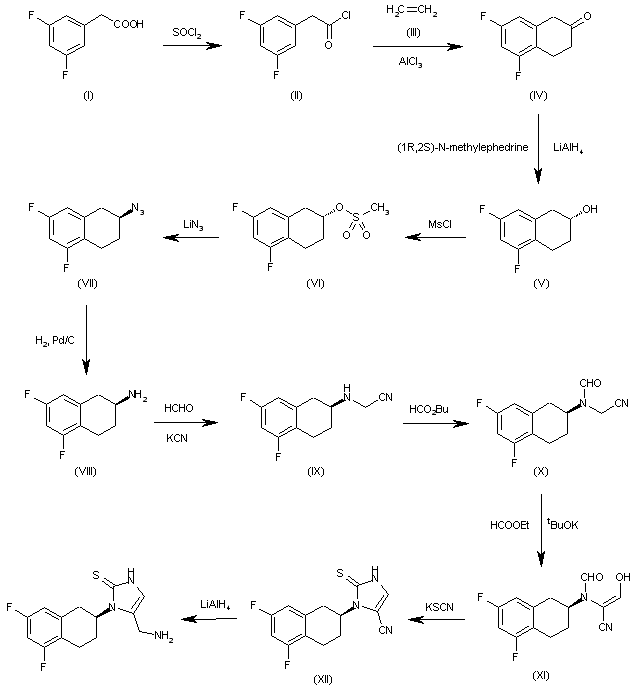 Reaction of L-aspartic acid (I) with trifluoroacetic acid and trifluoroacetic anhydride afforded N-trifluoroacetyl-L-aspartic anhydride (II). Then, Friedel-Crafts acylation of 1,3-difluorobenzene (III) with this anhydride in the presence of AlCl3 gave ketone (IV). The reduction of the carbonyl group of (IV) was effected by catalytic hydrogenation in the presence of Pearlman's catalyst, and the resulting phenylbutyric acid (V) was converted to acid chloride on treatment with PCl5 in cold dichloromethane, and subsequently cyclized by addition of AlCl3 to yield tetralone (VI). Hydrogenolysis of (VI) in the presence of Pearlman's catalyst gave tetrahydronaphthalene (VII), and further hydrolysis of trifluoroacetamide with LiOH yielded (S)-5,7-difluoro-1,2,3,4-tetrahydronaphthalen-2-yl amine (VIII). Imidazole ring was then constructed by treatment of this amine with 1,3-dihydroxyacetone (IX) and potassium thiocyanate in acidic medium, and the hydroxyl group of the resulting X was substituted by a formamido group by either heating in formamide at 175 C or with ammonium formate. Finally, formamide (XI) was hydrolyzed in refluxing isopropanolic HCl.