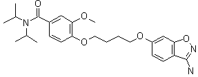 | 合成路线图解说明: Treatment of 4-hydroxy-3-methoxybenzoic acid (I) with thionyl chloride and then with diisopropyl amine provided amide (II). Alkylation of (II) with 1,4-dibromobutane and potassium carbonate in acetonitrile, followed by treatment with sodium iodide afforded iodobutylether (III). Then, alkylation of 2-fluoro-4-hydroxybenzonitrile (IV) with iodide (III) in the presence of sodium hydride in DMF gave (V), which was condensed with acetone oxime (VI) and potassium tert-butoxide to provide (VII). Finally, cyclization of (VII) in a refluxing hydroalcoholic solution of HCl generated the target benzisoxazole. |