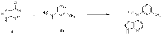 The title compound is prepared by condensation between 4-chloro-1H-pyrazolo[3,4-d]pyrimidine (I) and N-methyl-N-(3-methylphenyl)amine (II).