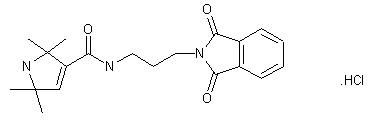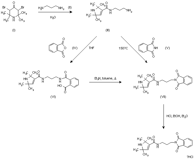 Pyrroline (III) was prepared by Favorskii rearrangement of 3,5-dibromo-2,2,6,6-tetramethylpiperidinone (I) in the presence of 1,3-diaminopropane (II). Acylation at the primary amino group of (III) with phthalic anhydride (IV) gave the 2-carboxybenzamide (VI), which was cyclized to the target phthalimide (VII) by refluxing in toluene in the presence of Et3N. Alternatively, the phthalimido derivative (VII) was obtained by condensation of amine (III) with phthalimide (V) at 150 C. The target compound was then isolated as the hydrochloride salt upon treatment with HCl in EtOH-Et2O.