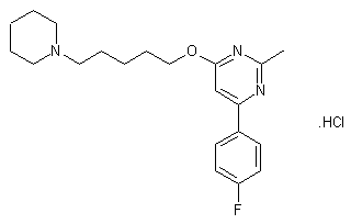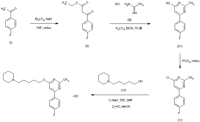 Claisen condensation of diethyl carbonate with p-fluoroacetophenone (I) produced keto ester (II). This was cyclized to the pyrimidine (IV) by treatment with acetamidine hydrochloride (III) in the presence of K2CO3 in hot EtOH. Chlorination of hydroxypyrimidine (IV) by means of POCl3 furnished the 4-chloropyrimidine (V). Finally, chloride displacement in (V) with the sodium alkoxide of 5-piperidino-1-pentanol (VI) gave rise to the target pyrimidinyl ether, which was isolated as the corresponding hydrochloride salt.