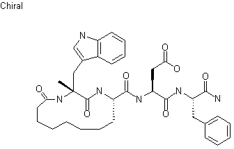 8-Bromooctanoic acid (I) was treated with 2-methylpropene (II) in the presence of sulfuric acid to afford tert-butyl ester (III). Alkylation of the benzylidene derivative of glycine methyl ester (IV) with bromide (III) using lithium diisopropylamide (LDA) and hexamethylphosphoramide (HMPA) in THF at -78 C, followed by imine hydrolysis with aqueous citric acid provided the racemic aminoester (V). This was condensed with Boc-a-methyl(R)tryptophan (VI) using (benzotriazol-1-yloxy) tris(dimethylamino)phosphonium hexafluorophosphate (BOP) as the coupling reagent, in the presence of diisopropylethylamine (DIEA) to give the protected dipeptide (VII) as a diastereomeric mixture, and further treatment with trifluoroacetic acid in dichloromethane and anisole removed both tert-butyl groups. The resulting linear compound (VIII) was cyclized by treatment with BOP and NaHCO3 in DMF to give (IX), which was then hydrolyzed with NaOH to afford acid (X). Coupling with the dipeptide Asp(OBzl)PheNH2 (XI) yielded (XII), and the obtained benzyl ester was finally deprotected by catalytic hydrogenolysis to provide the target compound, after separation of isomers by semipreparative HPLC.