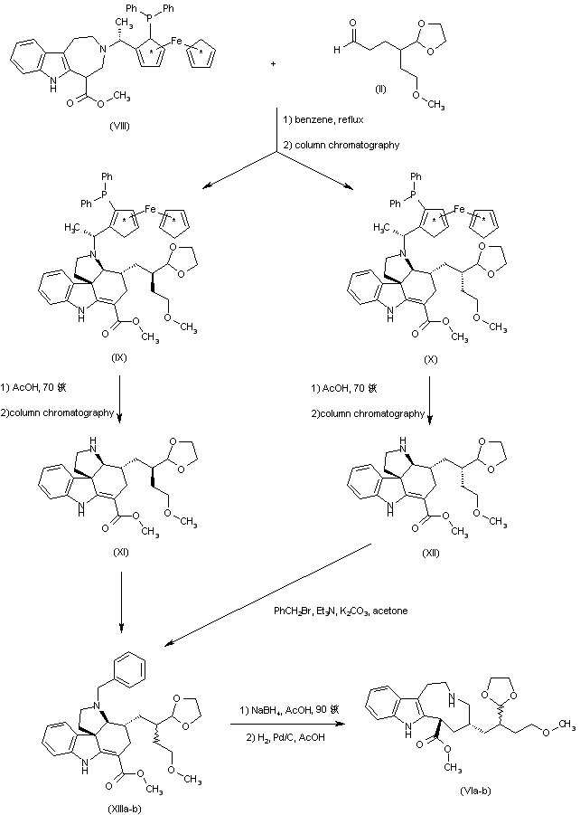 In an alternative procedure, aldehyde (II) was condensed with the indoloazepine (VIII) bearing a chiral N-alpha-ferrocenylethyl substituent to provide an equimolecular mixture of two separable C-20 epimeric diastereomers (IX) and (X), each accompanied by a minor diastereoisomeric byproduct. Cleavage of the ferrocenyl substituent with HOAc at 70 C provided the secondary amines (XI) and (XII). In this cleavage, the C-3,C-7 epimeric products were formed in 12% yield and were separated by chromatography. The major secondary amines (XI) and (XII) were N-benzylated to provide the corresponding tertiary amines (XIII). Reductive ring cleavage, followed by hydrogenolysis of the N-benzyl group, then gave the tricyclic compounds (VI), which were cyclized and rearranged as above.