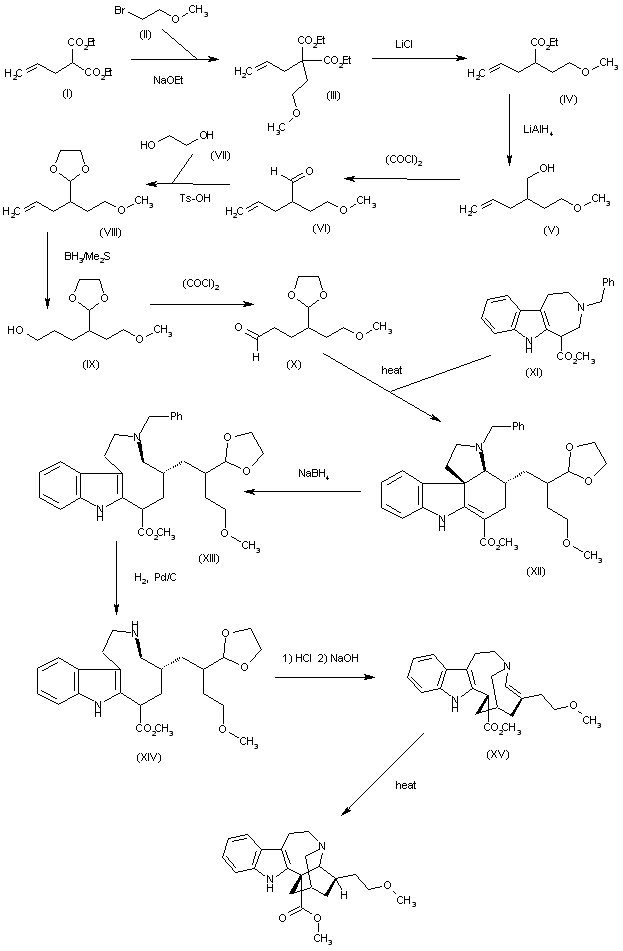 The condensation of allylmalonic acid diethyl ester (I) with 2-methoxyethyl bromide (II) by means of NaOEt in ethanol gives 2-allyl-2-(2-methoxyethyl)malonic acid diethyl ester (III), which is monodecarboxylated with LiCl in DMSO/DMF at 170 C to yield the pentenoic ester (IV). The reduction of the ester group of (IV) with LiAlH4 in dry ether affords the alcohol (V), which is oxidized to the corresponding aldehyde (VI) with (COCl)2 in dichloromethane. The protection of the aldehyde group of (VI) with ethyleneglycol (VII) and Ts-OH affords the cyclic ketal (VIII), which is treated with BH3/Me2S in dichloromethane to provide the primary alcohol (IX). The oxidation of (IX) with (COCl)2 as before gives the corresponding aldehyde (X), which is condensed with the indoloazepine (XI) in refluxing toluene, yielding the pyrrolocarbazole derivative (XII). The reductive ring opening of (XII) with NaBH4 in hot acetic acid affords the tricyclic intermediate (XIII), which is debenzylated with H2 over Pd/C in acetic acid to provide the secondary amine (XIV). The deprotection of the cyclic ketal group of (XIV) with HCl and HOAc, followed by treatment with NaOH, induces cyclization to the tetracyclic compound (XV), which is finally cyclized to the target compound in refluxing toluene.