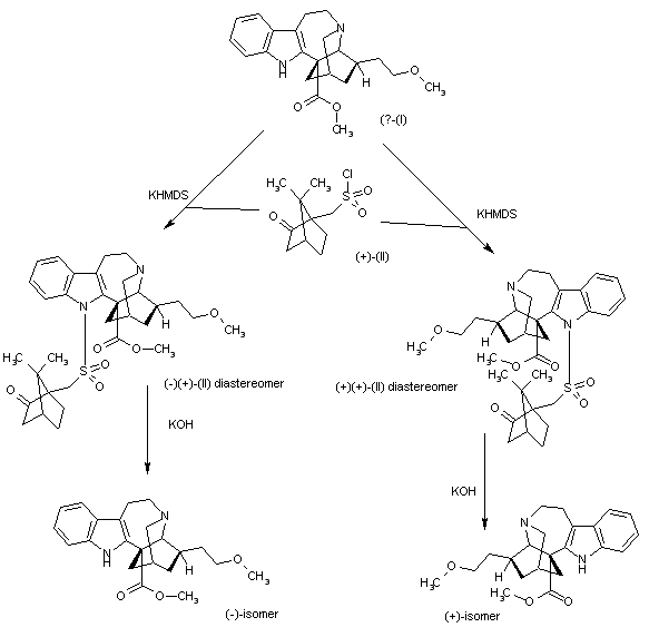 The condensation of (rac?-18-methoxycoronaridine with (S)-(+)-camphorsulfonyl chloride (II) by means of KHMDS in THF gives the corresponding mixture of the diastereomeric sulfonamides (-)-(+)-(III) and (+)-(+)-(III), which are separated by normal phase silica gel chromatography. Both diastereomers are treated with KOH in methanol, yielding the target (-)- and (+)-enantiomers.