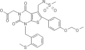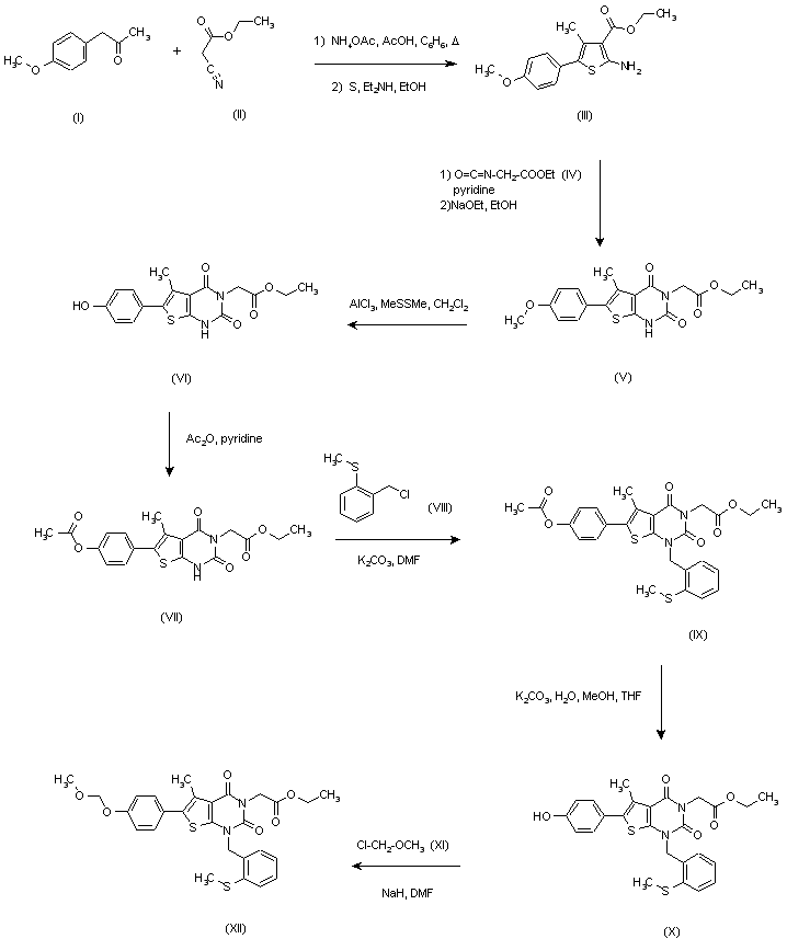 Thiophene (III) was obtained by condensation of (4-methoxyphenyl)acetone (I) with ethyl cyanoacetate (II) in the presence of NH4OAc and AcOH, followed by treatment with sulfur and diethylamine. Subsequent reaction of (III) with ethyl isocyanato-acetate (IV) in pyridine at 45 C and further cyclization with ethanolic NaOEt provided the thienopyrimidine (V). Cleavage of the methyl ether was performed by treatment with AlCl3 and dimethyl disulfide in CH2Cl2 at r.t. to afford phenol (VI), which was then acetylated with Ac2O in pyridine to give ester (VII). N-Alkylation with 2-(methylsulfanyl)benzyl chloride (VIII) in the presence of K2CO3 in DMF yielded (IX), and then the acetate ester was hydrolyzed with K2CO3 in a mixture of H2O/MeOH/THF. The resulting phenol (X) was alkylated with chloromethyl methyl ether (XI) in the presence of NaH to provide (XII).