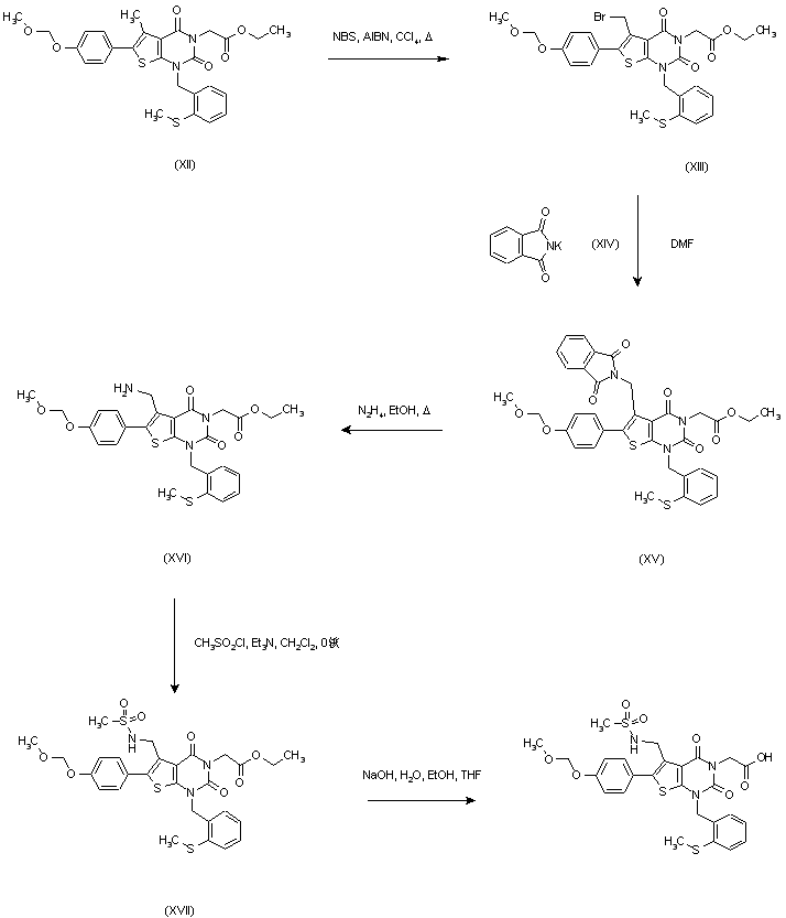 After bromination of the methyl group of (XII) with N-bromosuccinimide in the presence of 2,2'-azobis(isobutyro-nitrile) to give (XIII), the aminomethyl derivative (XVI) was obtained by condensation with potassium phthalimide (XIV) in DMF and subsequent hydrazinolysis of the resulting (XV). Treatment with methanesulfonyl chloride and triethylamine then provided sulfonamide (XVII), and the ester function was finally hydrolyzed to the target carboxylic acid with NaOH in a mixture of H2O/MeOH/THF.