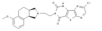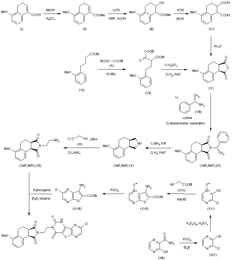 Treatment of carboxylic acid (I) with MeOH and H2SO4 yields methyl ester (II), which is then converted into cyano derivative (III) by reaction with LiCN in DMF and AcOH. Hydrolysis of (III) with aqueous KOH in EtOH provides dicarboxylic acid (IV), which is cyclized by means of Ac2O to give the dicarboxylic anhydride (V). Alternatively, (V) can be obtained by condensation of ester (VI) with diethyl oxalate (A) in Et2O in the presence of t-BuOK to afford (VII), which is cyclized with H2SO4 and submitted to catalytic hydrogenation over Pd/C. Condensation of anhydride (V) with (S)-alpha-methylbenzylamine yields a mixture of imides, from which (3aR,9bR)-(IX) is obtained by crystallization. Reduction of (3aR,9bR)-(IX) with BH3稵HF followed by hydrogenation over Pd/C affords isoindole derivative (X), which is then alkylated with chloroacetonitrile (XI) in acetonitrile in the presence of DIEA and reduced with LiAlH4 to give the primary amine (XII). Treatment of (XIII) with POCl3 and Et3N yields 2-chloro-3-cyanopyrazine (XIV), which is oxidized to provide (XV) by means of K2S2O8 in H2SO4. Treatment of N-oxide (XV) with ethyl thioglycolate (XVI) and NaOEt in DMF affords pyrazinothiophene (XVII), which is then chlorinated with POCl3 to give (XVIII). Finally, reaction of amine (XII) with (XVIII) and triphosgene in toluene and Et3N affords the desired product.