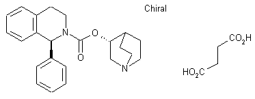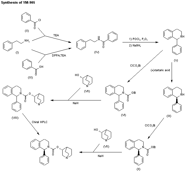 YM-905 has been obtained by two related ways: 1) The benzoylation of 2-phenylethylamine (I) with benzoyl chloride (II) and triethylamine in chloroform, or with benzoic acid (III), DPPA and triethylamine in DMF, gives the corresponding benzamide (IV), which is cyclized by means of POCl3 and P2O5 in refluxing xylene and reduced with NaBH4 in ethanol, yielding racemic 1-phenyl-1,2,3,4-tetrahydroisoquinoline (V). The reaction of (V) with ethyl chloroformate by means of K2CO3 in chloroform affords racemic 1-phenyl-1,2,3,4-tetrahydroisoquinoline-2-carboxylic acid ethyl ester (VI), which is transesterified with quinuclidine-3(R)-ol (VII) by means of NaH in refluxing toluene to provide the quinuclidinyl ester (VIII) as a diastereomeric mixture. This mixture is resolved by chiral HPLC, giving the target compound as a pure enantiomer. 2) The racemic 1-phenyl-1,2,3,4-tetrahydroisoquinoline (V) can also be submitted to optical resolution with (+)-tartaric acid to give 1(S)-phenyl-1,2,3,4-tetrahydroisoquinoline (IX), which is condensed with ethyl chloroformate by means of K2CO3 in chloroform to afford 1(S)-phenyl-1,2,3,4-tetrahydroisoquinoline-2-carboxylic acid ethyl ester (VI). This compound is transesterified with quinuclidine-3(R)-ol (VII) by means of NaH in refluxing toluene to directly provide the pure enantiomer.