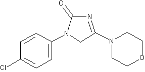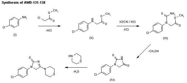 The synthesis of AWD 131-138 is obtained as illustrated in Scheme 25002101a: The alkylation of 4-chloroaniline (I) with chloroacetic acid methyl ester in ethanol gives N-(4-chlorophenyl)glycine methyl ester (II), which is added to cyanate by means of hydrochloric acid in glacial acetic acid to yield 3-(4-chlorophenyl)hydantoic acid methyl ester (III). The cyclization in hydrochloric acid yields 1-(4-chlorophenyl)hydantoin (IV), which is finally condensed with morpholine.