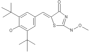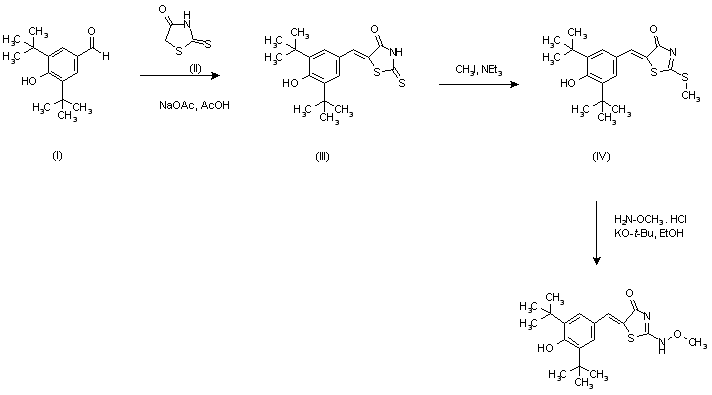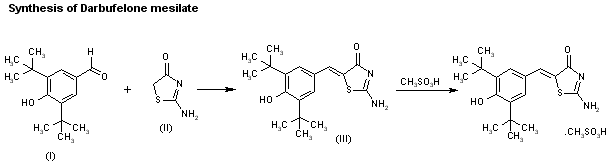 The condensation of 3,5-bis(tert-butyl)-4-hydroxybenzaldehyde (I) with 2-iminothiazolidin-4-one (II) in refluxing acetic acid gives darbufelone (III), which is then treated with methanesulfonic acid in THF.