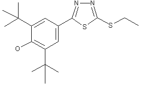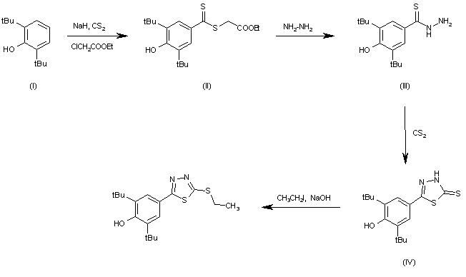 The reaction of 2,6-di(tert-butyl)phenol (I) with CS2 and ethyl chloroacetate gives the dithiobenzoate (II), which is treated with hydrazine in ethanol yielding the thiobenzoyl hydrazide (III). The cyclization of (III) with CS2 in refluxing ethanol affords the thiadiazolethione (IV), which is finally condensed with ethyl iodide and NaOH in THF.