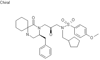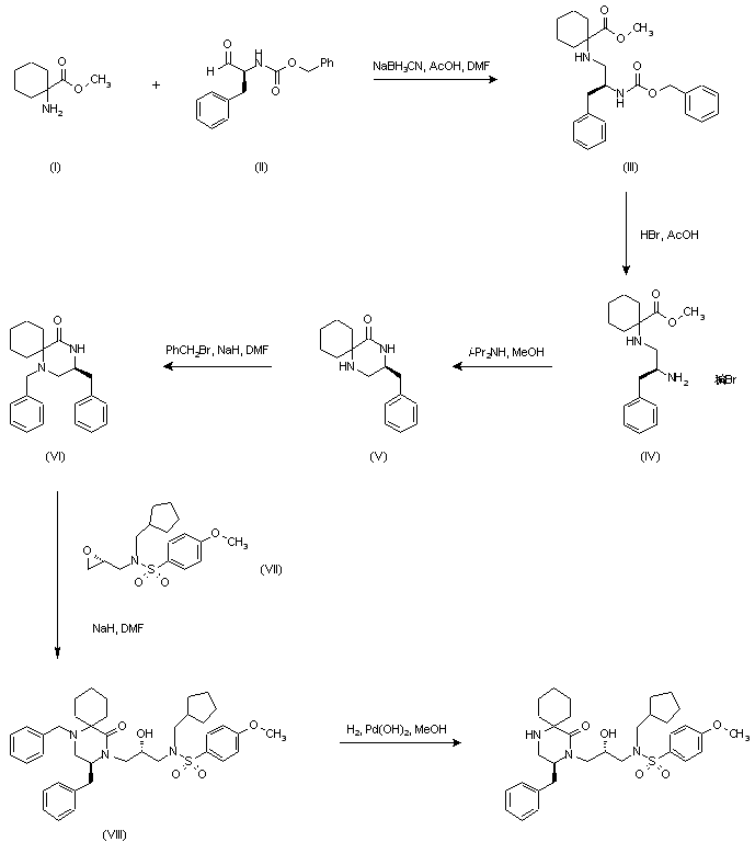 Reductive alkylation of aminoester (I) with N-Cbz-L-phenylalaninal (II) using NaBH3CN and AcOH in DMF provided compound (III). Subsequent deprotection of the Cbz group of (III) with HBr in AcOH afforded the diamine salt (IV), which upon basification with diisopropylamine resulted in lactamization to produce piperazinone (V). The secondary amine of (V) was then protected by alkylation with benzyl bromide to give (VI), which was condensed with the epoxisulfonamide (VII) in the presence of NaH in DMF to furnish (VIII). Finally, hydrogenolysis of the N-benzyl group in the presence of Pd(OH)2 yielded the target compound.