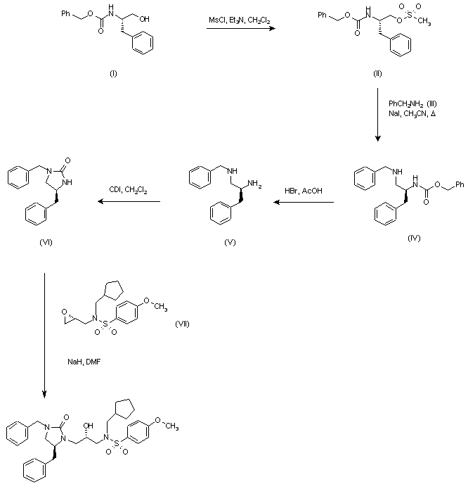 N-Cbz-L-Phenylalaninol (I) was converted to mesylate (II) on treatment with methanesulfonyl chloride and Et3N, and then treated with benzylamine (III) in the presence of NaI to give (IV). Subsequent deprotection of the Cbz group of (IV) with HBr in AcOH afforded diamine (V), which was treated with carbonyl diimidazole to produce the cyclic urea (VI). Finally, condensation with the epoxisulfonamide (VII) in the presence of NaH in DMF provided the target compound.