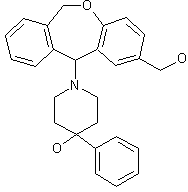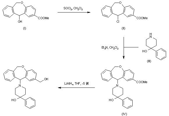 Hydroxy dibenzooxepine (I) was converted to the corresponding chloride (II) by treatment with SOCl2 in CH2Cl2. Condensation of (II) with 4-hydroxy-4-phenylpiperidine (III) produced adduct (IV). The carboxylate group of (IV) was then reduced by means of LiAlH4 in cold THF to furnish the title alcohol.