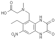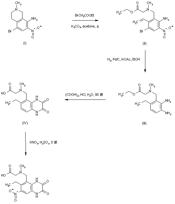 Hofmann degradation of tetrahydroisoquinoline (I) with ethyl bromoacetate in the presence of K2CO3 in refluxing acetone produced benzylamine derivative (II). Catalytic hydrogenation of the vinyl and nitro groups of (II) in the presence of Pd/C yielded phenylenediamine (III). This was cyclized with oxalic acid in 2 N HCl at 90 C to afford quinoxalinedione (IV). Finally, nitration of (IV) using KNO3 in cold H2SO4 gave the title compound.