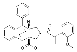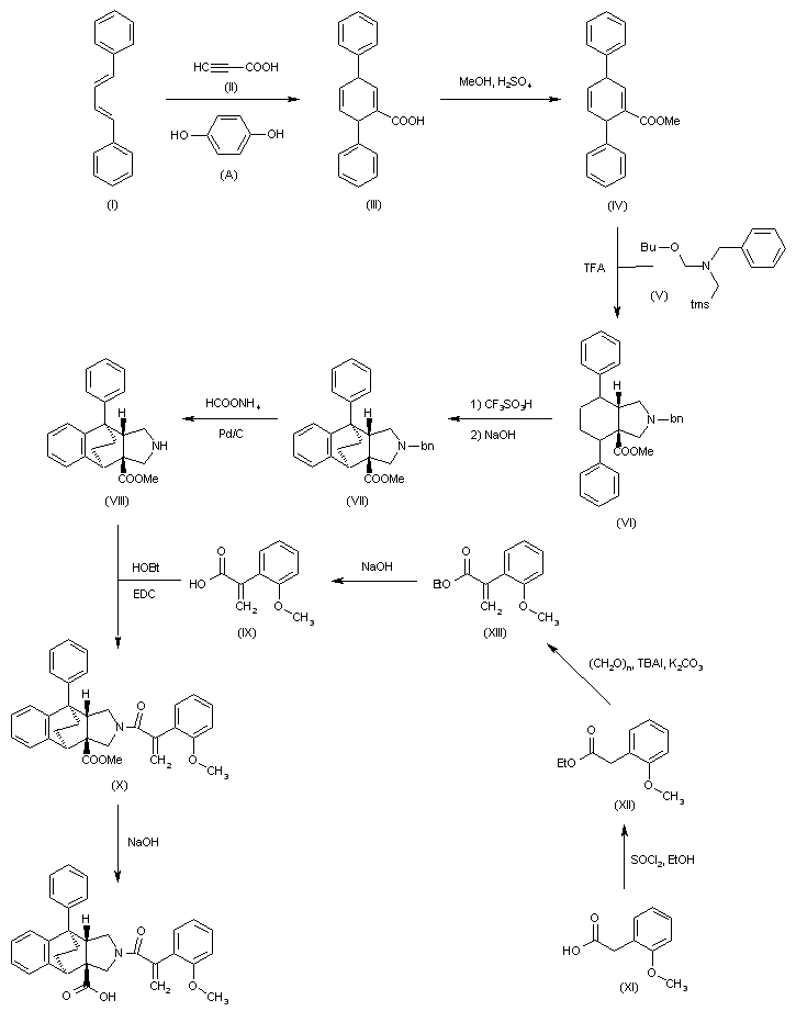 Diels-Alder reaction between (E,E)-1,4-diphenylbutadiene (I) and propiolic acid (II) in xylene in the presence of hydroxyquinone (A) yields cyclohexadiene carboxylic acid (III), which is then converted into its methyl ester derivative (IV) by treatment with MeOH in the presence of H2SO4. Condensation of methyl ester (IV) with N-trimethylsilylmethyl-N-butoxymethyl-benzylamine (V) in CH2Cl2 in the presence of TFA provides hexahydro isoindole derivative (VI), which is first treated with trifluoromethane sulfonic acid in CH2Cl2, followed by treatment with NaOH, to furnish benzo[f]isoindole derivative (VII). Debenzylation of (VII) by reaction with ammonium formate and Pd/C gives compound (VIII), which is then converted into derivative (X) by coupling with 2-(2-methoxyphenyl)acrylic acid (IX). The target product is finally obtained by hydrolysis of methyl ester (X) with NaOH in EtOH. Intermediate (IX) can be obtained as follows: Treatment of 2-methoxyphenylacetic acid (XI) with thionyl chloride in refluxing EtOH provides ethyl ester (XII), which then reacts with paraformaldehyde and tetrabutylammonium iodide (TBAI) and K2CO3 in refluxing toluene to afford acrylate (XIII). Finally, ethyl ester (XIII) is hydrolyzed by treatment with refluxing NaOH.