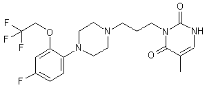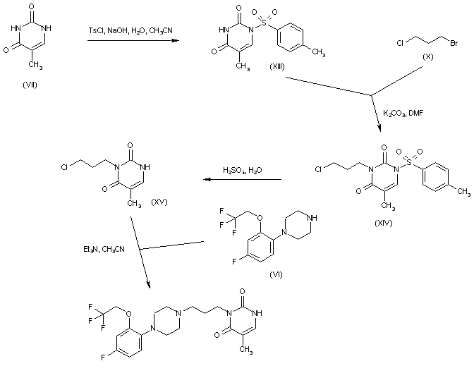 The condensation of 2-nitrophenol (I) with 2,2,2-trrifluoroethyl p-toluenesulfonate (II) by means of K2CO3 in DMF gives 2-(2,2,2-trifluoroethoxy) nitrobenzene (III), which isreduced with H2 over PtO2 in ethanol yiedling the aniline (IV). The cyclization of (IV) with bis (2-chloroethyl)amine (V) and K2CO3 affords the piperazine (VI), which is condensed with 1-benzyl-3-(3-chloro-propyl)-5-methylpyrimidine-2,4(1H,3H)-dione (VII) by means of K2CO3 in refluxing acetonitrile to give the benzylated target compound (VIII). Finally, this compound is deprotected by hydrogenation with ammonium formate and Pd/C. The intermediate pyrimidine (VII) has been obtained by benzylation of thymine (IX) with benzyl bromide and K2CO3 to give the 1-benzylthymine (X), which is alkylated with 1-bromo-3-chloropropane and K2CO3 to the target intemediate (VII).