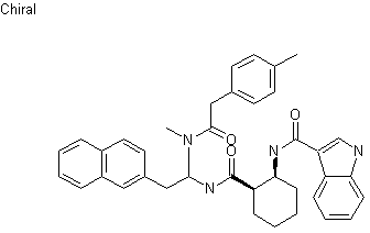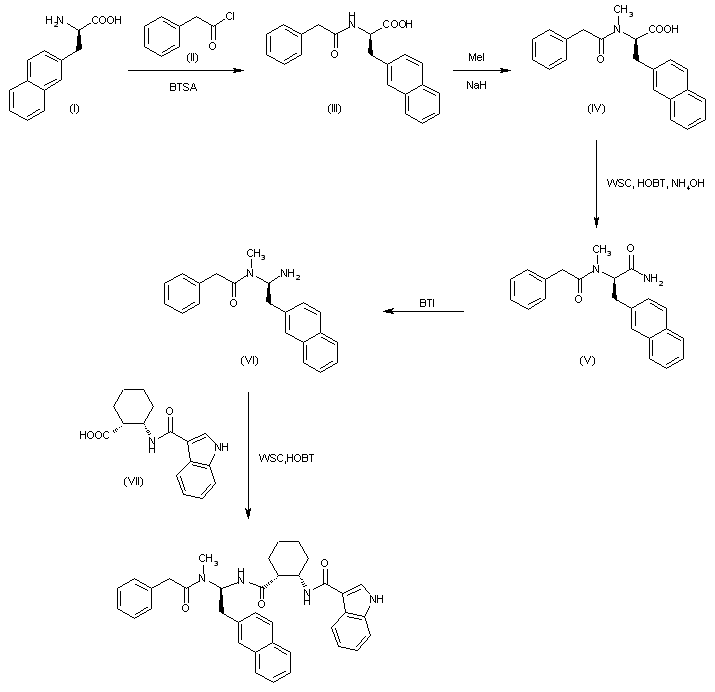 The acylation of 3-(2-naphthyl)-D-alanine (I) with phenylacetyl chloride (II) and bis(trimethylsilyl)acetamide in THF gives the expected N-phenylacetyl derivative (III), which is methylated with NaH and methyl iodide in THF yielding the N-methyl derivative (IV). The reaction of (IV) with 1-ethyl-3-[3-(dimethylamino)propyl]carbodiimide (WSC), HOBT and ammonium hydroxide affords the corresponding alaninamide (V), which by reaction with bis(trifluoroacetoxy)iodobenzene (BTI) in acetonitrile is converted into the monoacylated gemdiamine (VI). The condensation of (VI) with cis-2-(1H-indol-3-ylcarboxamido)cyclohexanecarboxylic acid (VII) by means of WSC and HOBT in DMF affords the target compound as a diastereomeric mixture that is separated by preparative RP-HPLC.